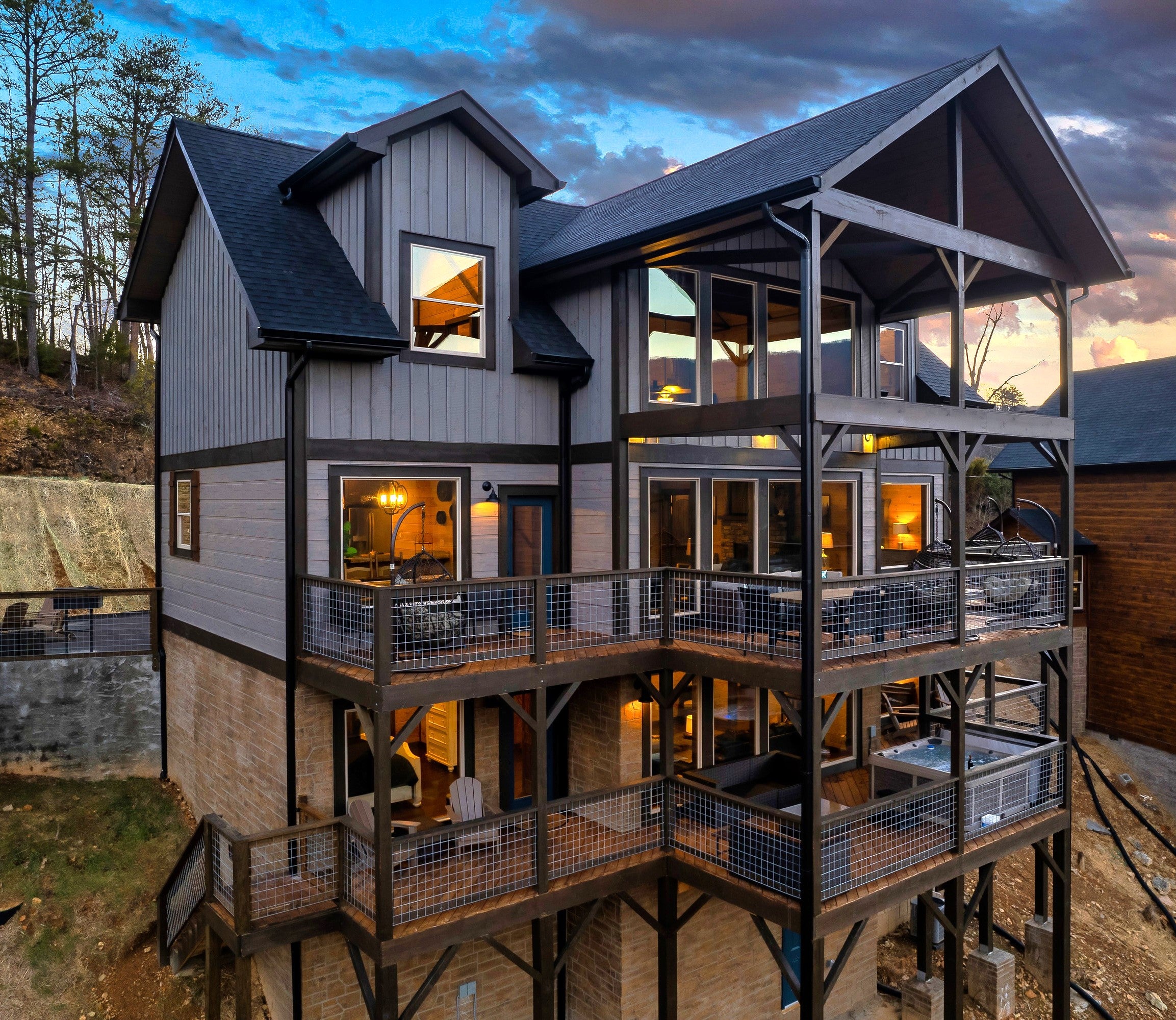 Wake up to breathtaking views of nature from Vixen Views, a sprawling 3-story mountain cabin, perfect for enjoying the great outdoors. Shoot some pool, play video games or sip cocktails. Gaze at starry skies and relax by the fire pit. Sink into the luxury hot tub, away from everything.