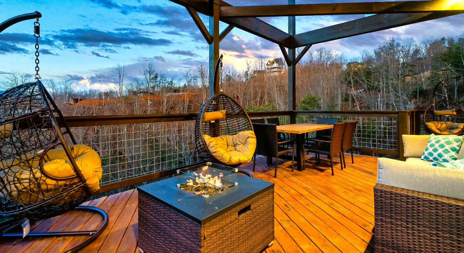 Enjoy Gatlinburg’s unrivaled natural beauty, without ever leaving home. Step onto either of the two shady and private decks to enjoy unparalleled panoramas of the Smokies and the valley below. Relax on a choice of luxury seating areas, including cozy egg chairs. Enjoy coffee and breakfast before heading out on a hike, then sink into the bubbling hot tub afterward. Roast marshmallows at the fire pit, surrounded by your loved ones. Eat, drink, and be merry!